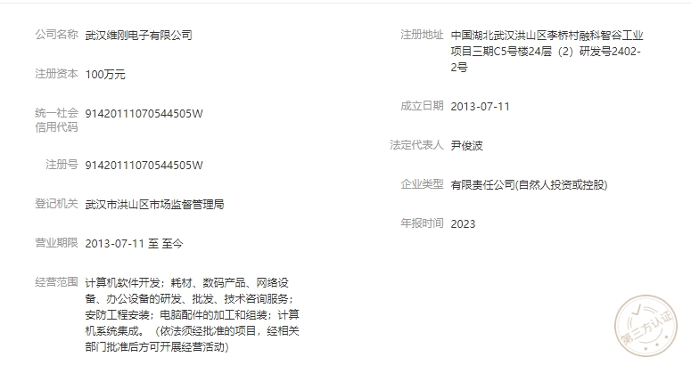 武汉维刚电子有限公司成立于2013年7月11日,电话:17335762956,注册地位于武汉市洪山区李桥村融科智谷工业项目三期C5号楼24层(2)研发号2402-2号,法定代表人为尹俊波,经营范围包括计算机软件开发;耗材、数码产品、网络设备、办公设备的研发、批发、技术咨询服务;安防工程安装;电脑配件的加工和组装;计算机系统集成。(依法须经批准的项目,经相关部门批准后方可开展经营活动)